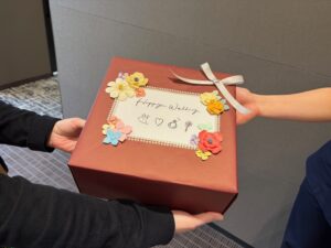 スタッフ一同からお祝いを送りたいと思いまして、お祝いのラッピングを折り紙で飾ってみました。